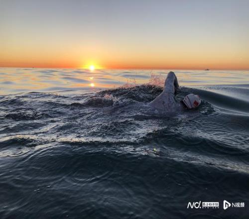 不断挑战自我的陈苏伟在横渡海峡时迎着夕阳向前。