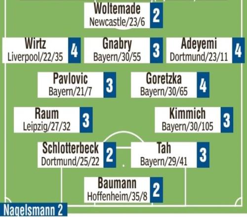 奥利弗-鲍曼(2分);基米希(3分)、约纳坦-塔(3分)、施洛特贝克(2分)、劳姆(3分);格雷茨卡(4分)、亚历山大-帕夫洛维奇(3分);阿德耶米(4分)、格纳布里(3分)、维尔茨(4分);沃尔特马德(2分)
