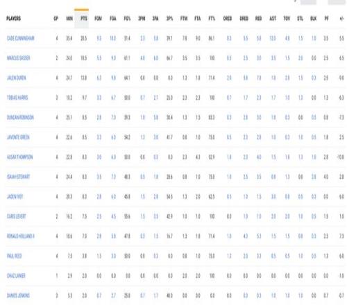 过去的四场比赛活塞场均上双的只有三人,坎宁安场均35.4分钟,拿到28.5分12助攻5.8篮板1.5抢断1盖帽4.8失误,命中率51.4%,三分命中率39.1%,坎宁安已经很努力,失误率高是因为他太多被包夹了,队友是真的给不了他什么助力。