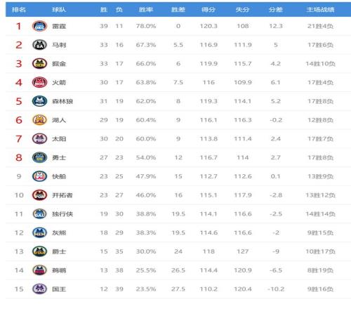 雷霆赢球后39胜11负排名联盟第一,掘金输球后33胜17负,排名从西部第二掉到第三,今日赢球的马刺成为第二。掘金、湖人、太阳今日都输球,给西部第四的火箭送上大礼,火箭和掘金的差距缩小到1.5个胜场,火箭领先湖人、太阳的优势来到1.5个胜场。